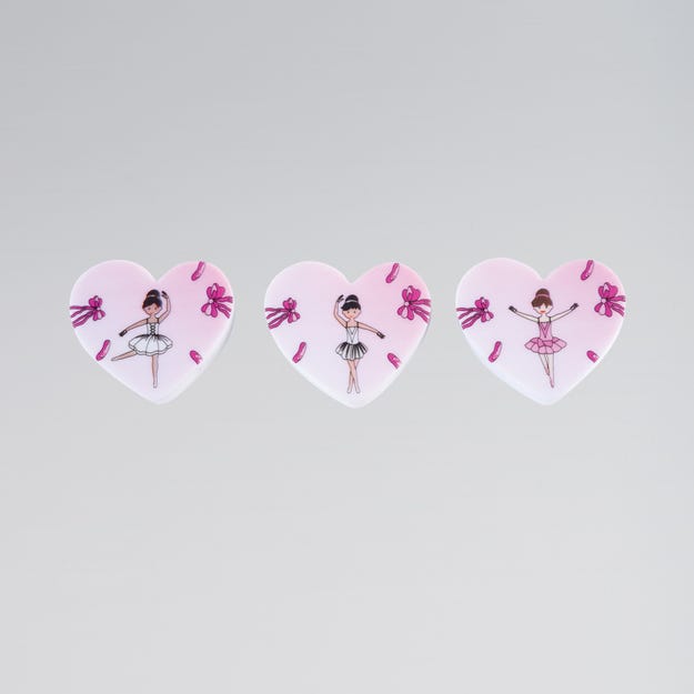 Vaaleanpunainen ballerinasetti sisältää kolme sydämen muotoista kumia.