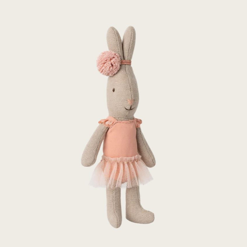 Tunnettu Maileg-mikropupu on pukeutunut balettitanssijaksi. Hänellä on puku ja tyllihame, sekä korvien ympärillä on pieni koristelu.