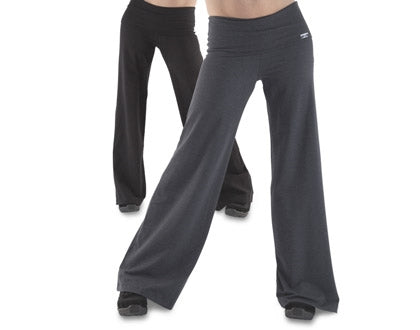 Harmaat, leveälahkeiset lämmittelyhousut Plume Dancelta. Vyötärö taittuu housuissa alas. Puuvilla/elastaani.