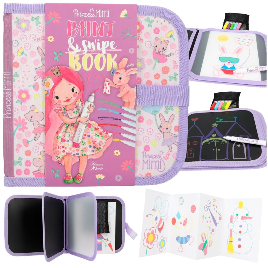 Hauskaa piirustuspuuhaa uudelleen ja uudelleen! Piirrä kankaisen Pricess Mimi -kirjan neljälle mustalle sivulle, tai jäljennä kuvioita läpinäkyvälle sivulle. Kun kuva on valmis, sen voi pyyhkiä pois kostealla talouspaperilla, ja sivuille voi piirtää uudelleen. Mukana on pieni kirjaan ommeltu pussi, joka sisältää 6 pieneen käteen sopivaa tussia.
